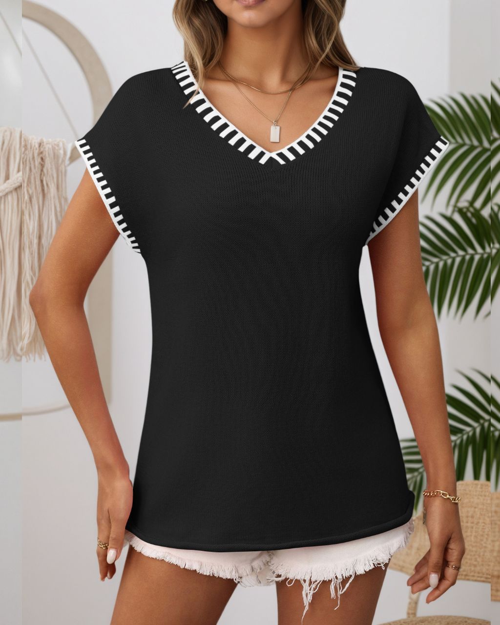 Elegant womens knitted v neck top with black/white neck line. Relaxed fit