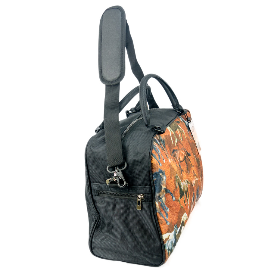 Fantastic overnight bag/ travel bag featuring print of a horses and horses. Features: – Adjustable padded shoulder strap. – Two carry handles – Internal zippered pocket – Four sturdy rubber feet – Tough zippers and hardware – Material is felt on the print face, and heavy duty canvas for the remaining exterior, polyester interior. Measures 44cm Wide x 31 High Why Use Felt? Anti Static Recoverable Colorfast Shock Absorber Mildew Proof Washable Heat Resistant Breathable Warp Resistant Water Proof Odourless Easy Maintenance