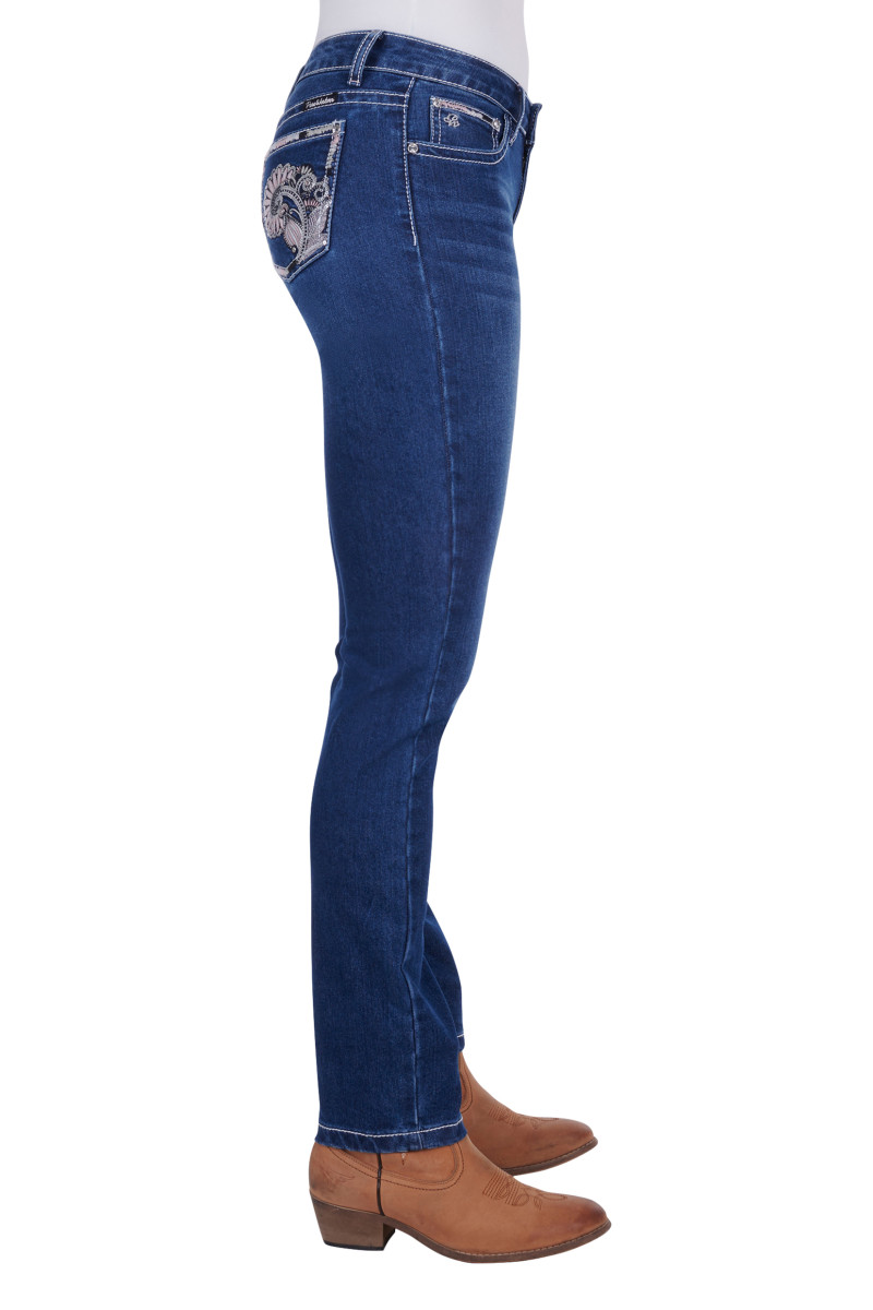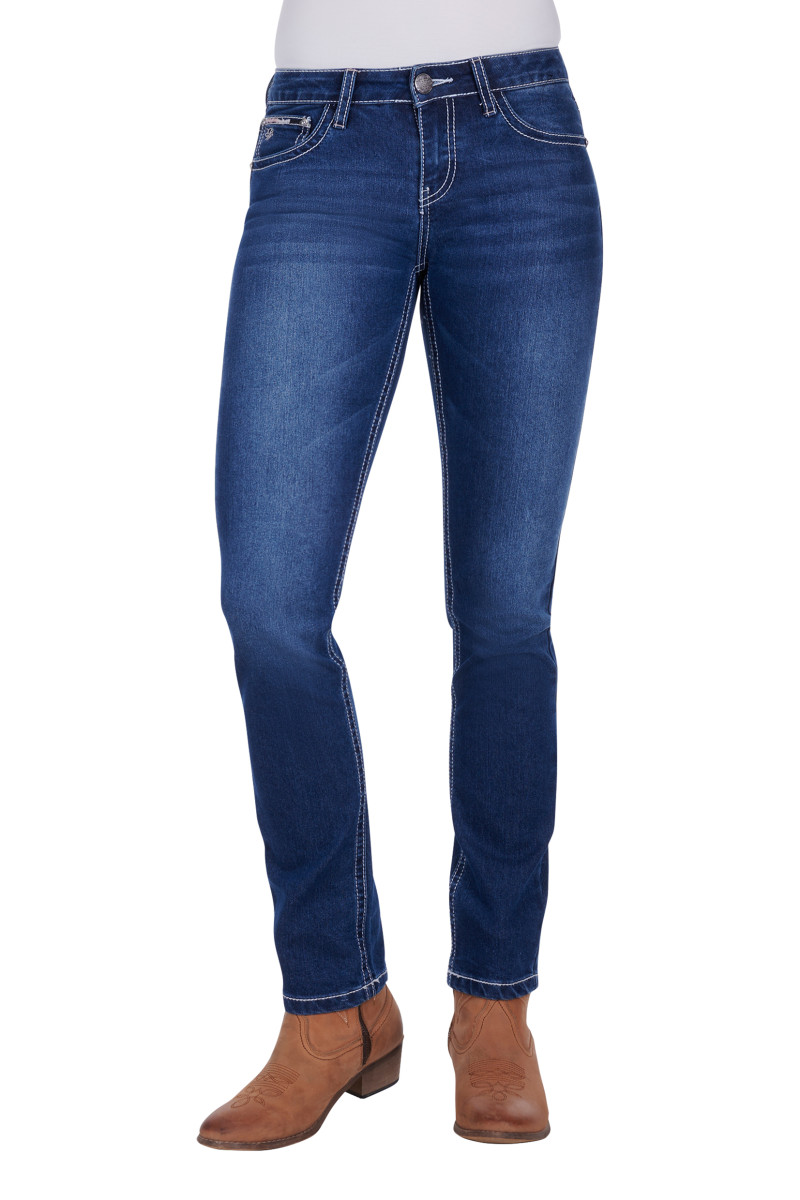 32 Inch leg – skinny, stretch for comfort, mid rise, logo shank button, diamante rivets, woven logo badge on back yoke, PW embroidery on coin pocket, feature embroidery on back pockets and front scoop pockets, contrast all over topstitch